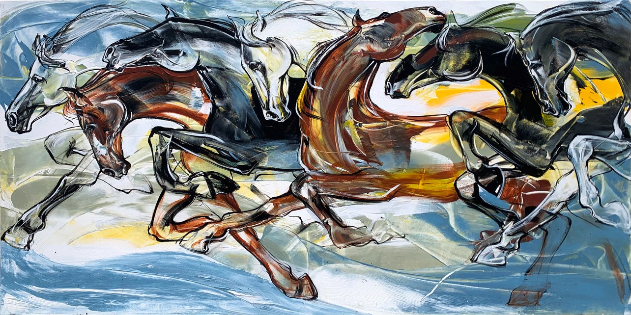 A dynamic abstract painting of horses in motion, blending bold strokes and vibrant colors to capture the raw power, speed, and unrestrained spirit of the herd.